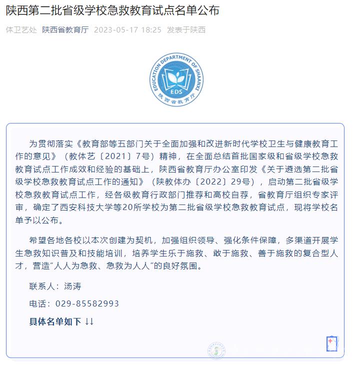 5月17日,陕西省教育厅公布了第二批省级学校急救教育试点单位名单,陕西机电职业技术学院成功入选。