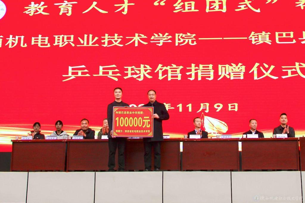 活动现场,在镇巴县职业中学全体师生的见证下,陕西机电职院向镇巴县职业中学捐赠10万元建设室内乒乓球馆。