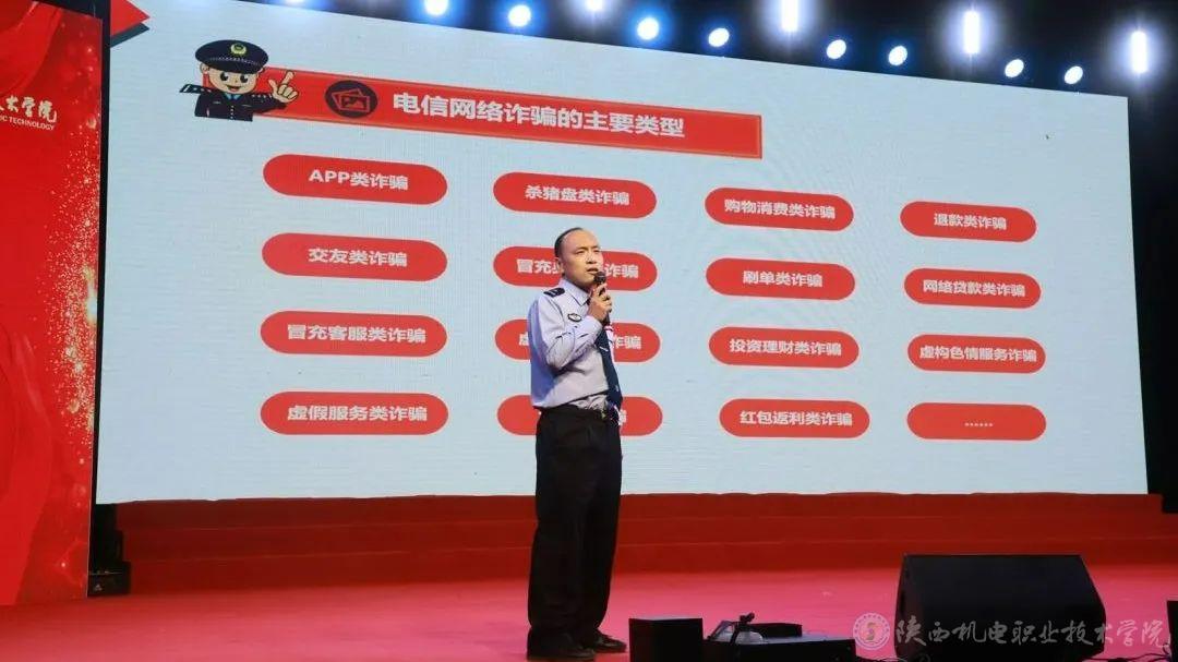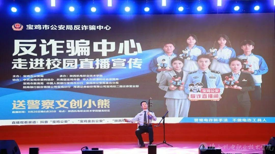 9月26日和27日,陕西机电职业技术学院联合宝鸡市公安局、宝鸡市人社局、中共宝鸡市委网信办、共青团宝鸡市委、中国人民银行宝鸡市分行、宝鸡市公安局金台分局、招商银行宝鸡分行、海通证券股份有限公司宝鸡经二路证劵营业部隆重举办了2024年“相聚机电 启程梦想 喜迎七十五华诞 反诈宣传进校园 护航青春助成长”主题迎新晚会。活动以“线下宣讲+线上直播”的方式,为4000余名在校学生送出了一份特别的开学礼。